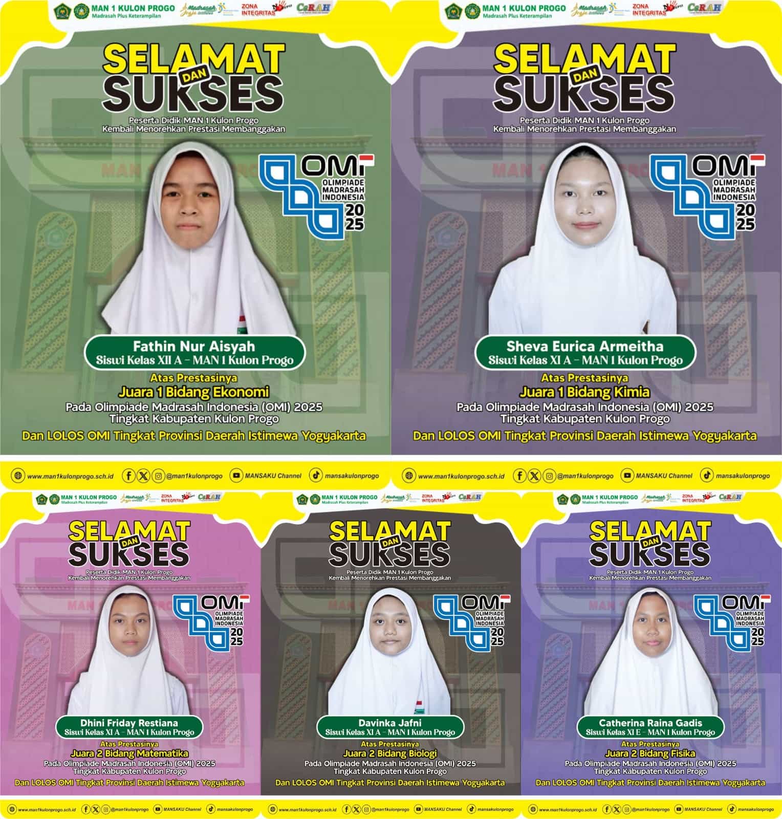 Pada jenjang MA, OMI tahun ini mempertandingkan enam bidang studi, yakni Matematika, Geografi, Fisika, Ekonomi, Biologi, dan Kimia. Dari enam bidang tersebut, MAN 1 Kulon Progo berhasil menyabet juara di lima di antaranya. Adapun siswa berperestasi tersebut antara lain :