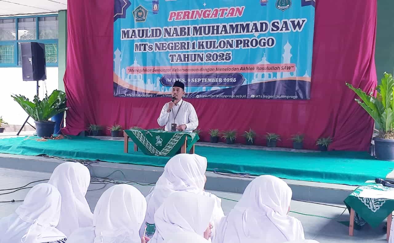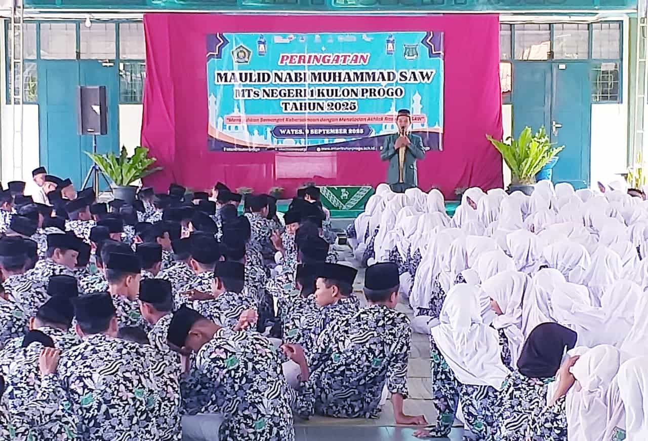 Kulon Progo (MTsN1KP) – MTsN 1 Kulon Progo menggelar pengajian dalam rangka memperingati Maulid Nabi Muhammad SAW. Acara ini diikuti oleh seluruh siswa, guru, dan pegawai pada Selasa (9/9/2025) di hall madrasah. Rangkaian acara diawali dengan penampilan hadrah Madtsanesa dan pidato bahasa Inggris oleh El Rochima R. A. Kepala Madrasah, Munji Jakfar, S.Pd.I., M.Pd.I., menyampaikan harapan dalam sambutannya.