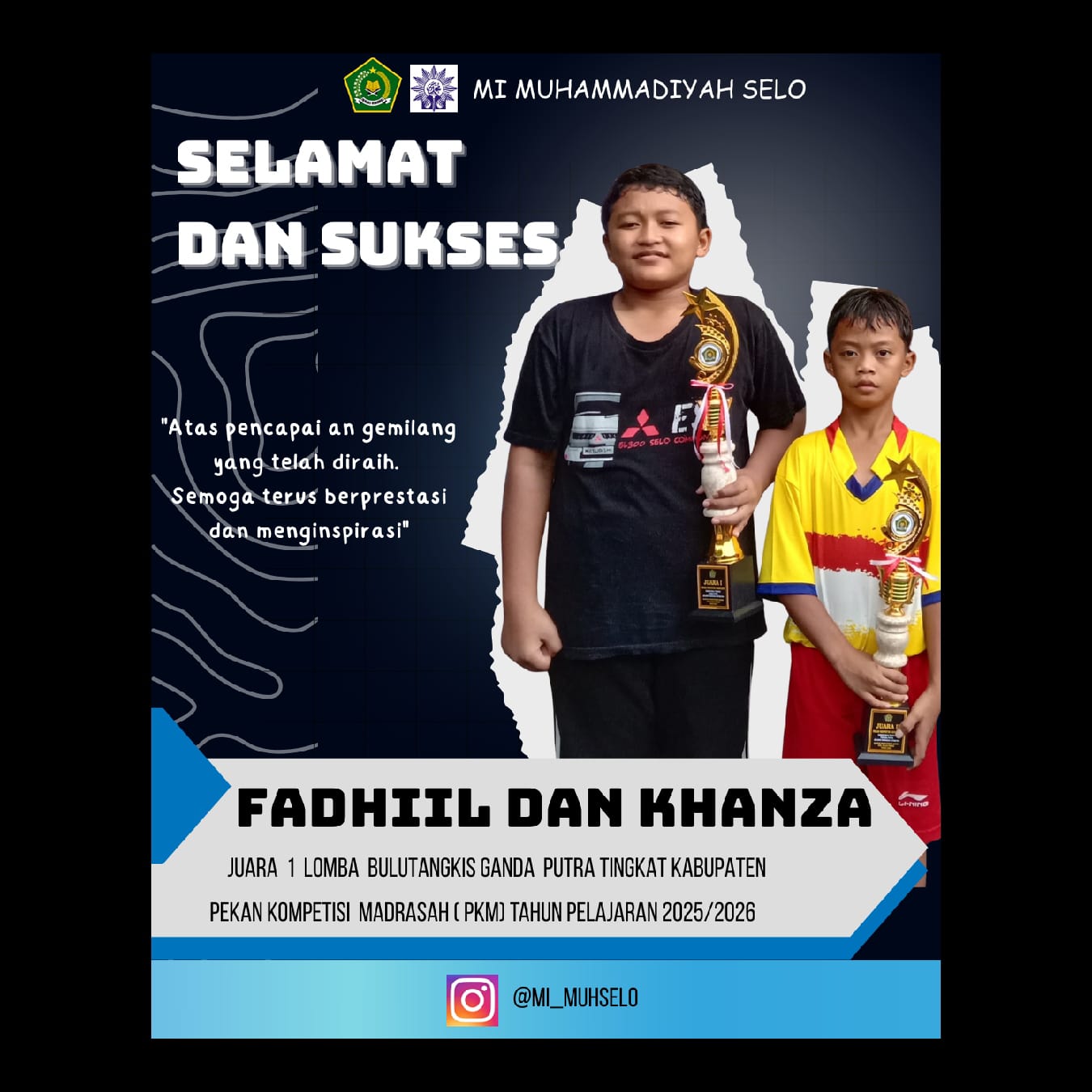 Kulon Progo (MISEL) – Pasangan Bulu Tangkis Ganda Putra MI Muhammadiyah Selo berhasil menyabet juara pertama PKM Kementerian Agama Kabupaten Kulon Progo, Rabu (1/10/2025). Mereka adalah Fadhiil Alif Ramadhan (siswa kelas 6) dan Khanza Rakha Mahardhika (Siswa kelas 4). Rencananya pasangan Bulu Tangkis Ganda Putra akan berlaga di tingkat Propinsi DIY.