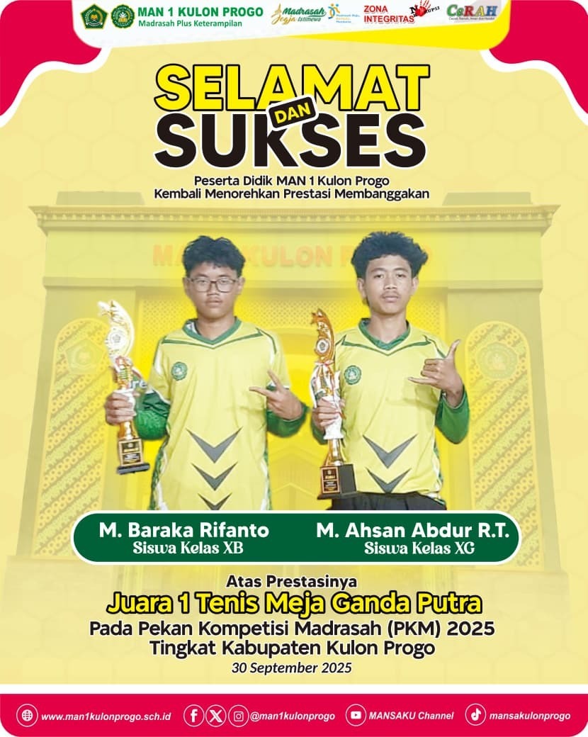 Kulon Progo (MAN 1 KP) – Prestasi membanggakan kembali diraih oleh MAN 1 Kulon Progo dalam ajang Pekan Kompetisi Madrasah (PKM) 2025 tingkat Kabupaten Kulon Progo. Kali ini datang dari cabang olahraga tenis meja, di mana pasangan ganda putra MAN 1 Kulon Progo, M. Baraka Rifanto dan M. Ahsan Abdur R.T., berhasil meraih Juara 1 pada pertandingan yang berlangsung Selasa (30/9/2025).