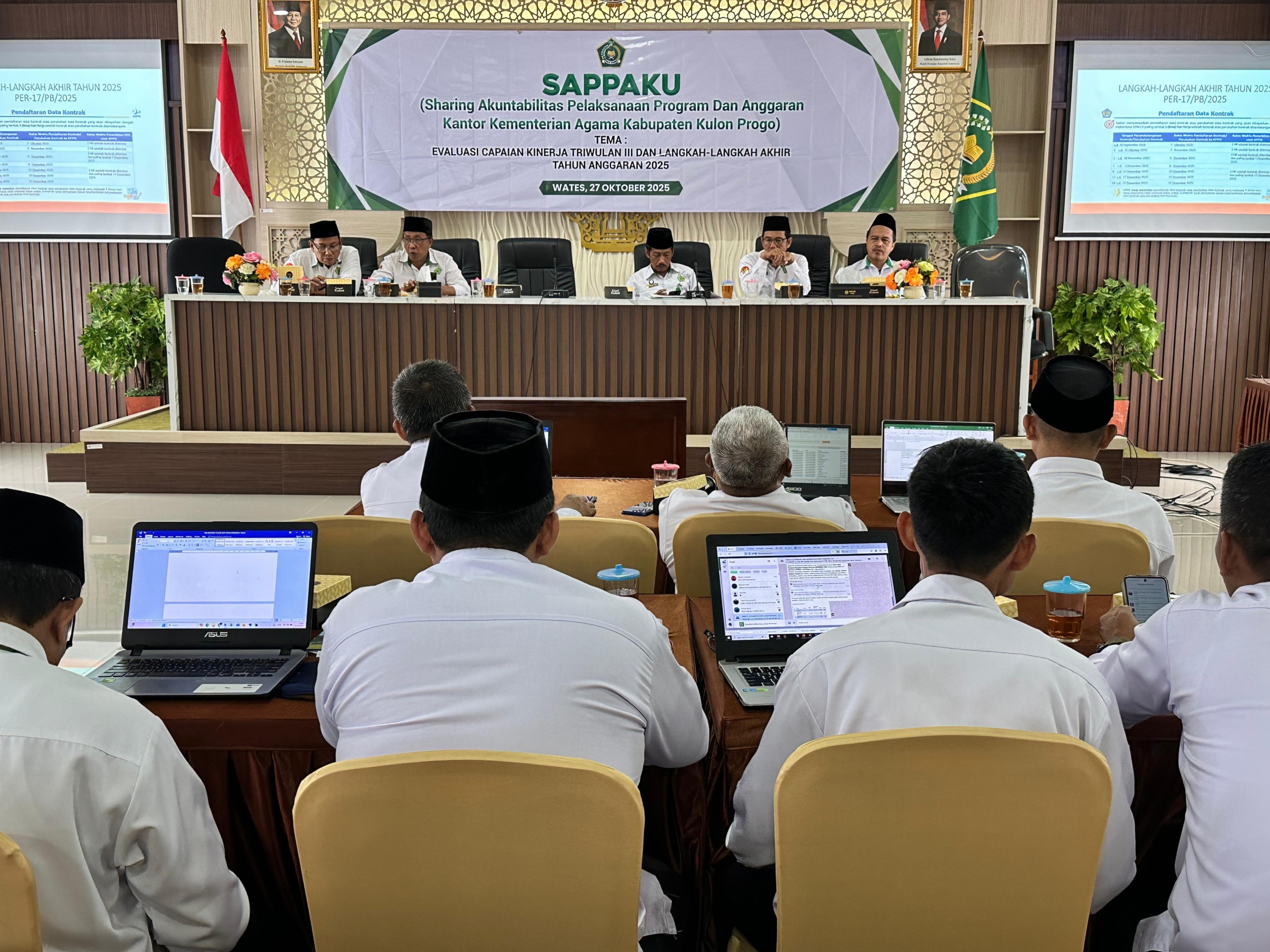 Kulon Progo (Kankemenag) – Memasuki Triwulan IV jelang akhir tahun anggaran 2025 Kankemenag Kulon Progo menggelar evaluasi pelaksanaan program dan anggaran. Eavluasi dikemas dalam program Sharing Akuntabilitas Pelaksanaan Program dan Anggaran Kankemenag Kulon Progo (Sappaku). Kepala Kankemenag Kulon Progo, H.M. Wahib Jamil, S.Ag. M.Pd. menyampaikan hal itu di seal-sela Sappaku yang berlangsung di Aula PLHUT kantor setempat, Senin (27/10/2025) pagi.