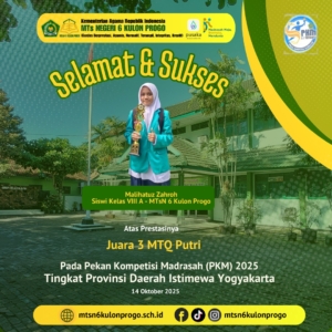 Kulon Progo (MTsN6KP) — Siswi kelas VIII A Madrasah Tsanawiyah Negeri (MTsN) 6 Kulon Progo, Malihatuz Zahroh berhasil mencatatkan prestasi signifikan. Yakni dengan meraih juara ketiga dalam cabang Musabaqah Tilawatil Quran (MTQ) pada ajang Pekan Kompetisi Madrasah (PKM) Tingkat DIY.