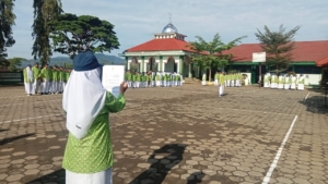Siswa Eka Wahyu Cahyanti membacakan Ikrar dengan tegas, yang menekankan kesadaran bahwa rongrongan terhadap NKRI dimungkinkan karena kelengahan, sekaligus membulatkan tekad untuk mempertahankan dan mengamalkan nilai-nilai Pancasila sebagai sumber kekuatan demi keutuhan bangsa.