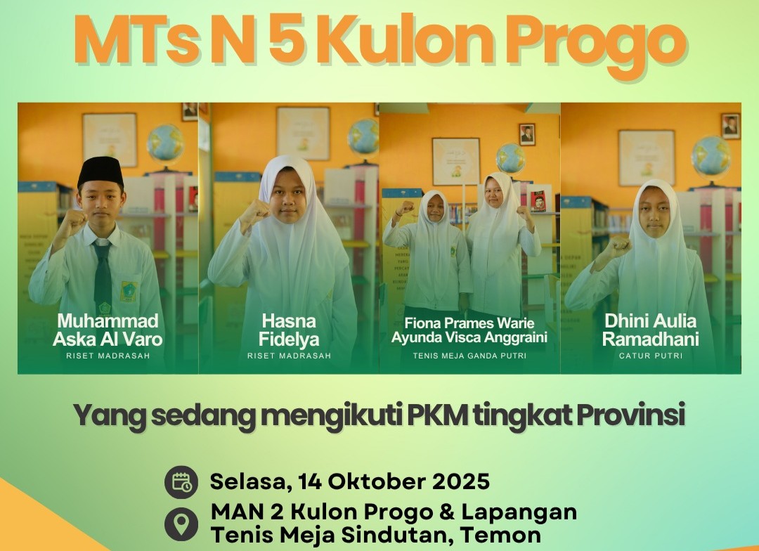 Dari cabor Tenis Meja, madrasah menaruh harapan pada duet maut Fiona Prames Warie dan Ayunda Visca Anggraini. Sementara itu, di cabor Catur, nama Dhini Aulia Ramadhani menjadi andalan utama. Tak hanya di bidang olahraga, MTsN 5 Kulon Progo juga unjuk gigi di bidang ilmiah melalui kompetisi PKM Riset Presentasi dan Gelar Karya Inovasi yang akan diperjuangkan oleh tim cerdas Muhammad Aska Al Varo dan Hasna Fidelya. Persiapan matang yang telah dilakukan diharapkan mampu membuahkan hasil maksimal.