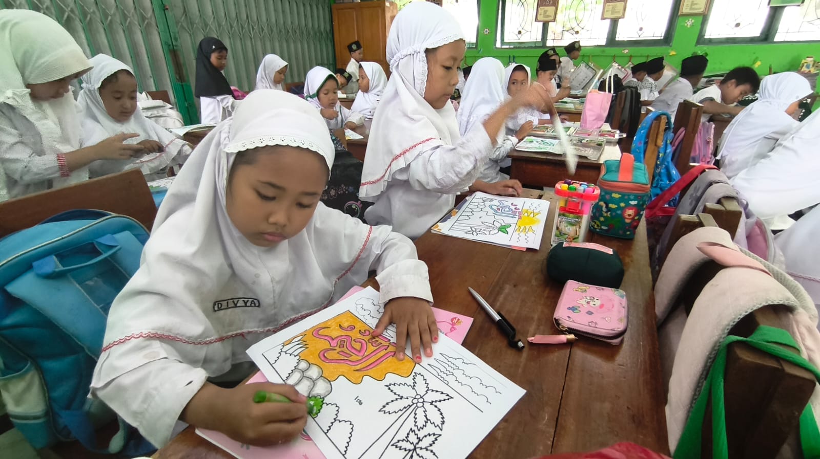 Siswa kelas I hingga III tampak antusias mewarnai kaligrafi yang telah disiapkan guru. Sedangkan siswa kelas IV hingga VI membuat kaligrafi secara mandiri dengan berbagai media dan gaya tulisan. Suasana madrasah terasa semarak dengan warna-warna cerah dan ekspresi bahagia dari para peserta.