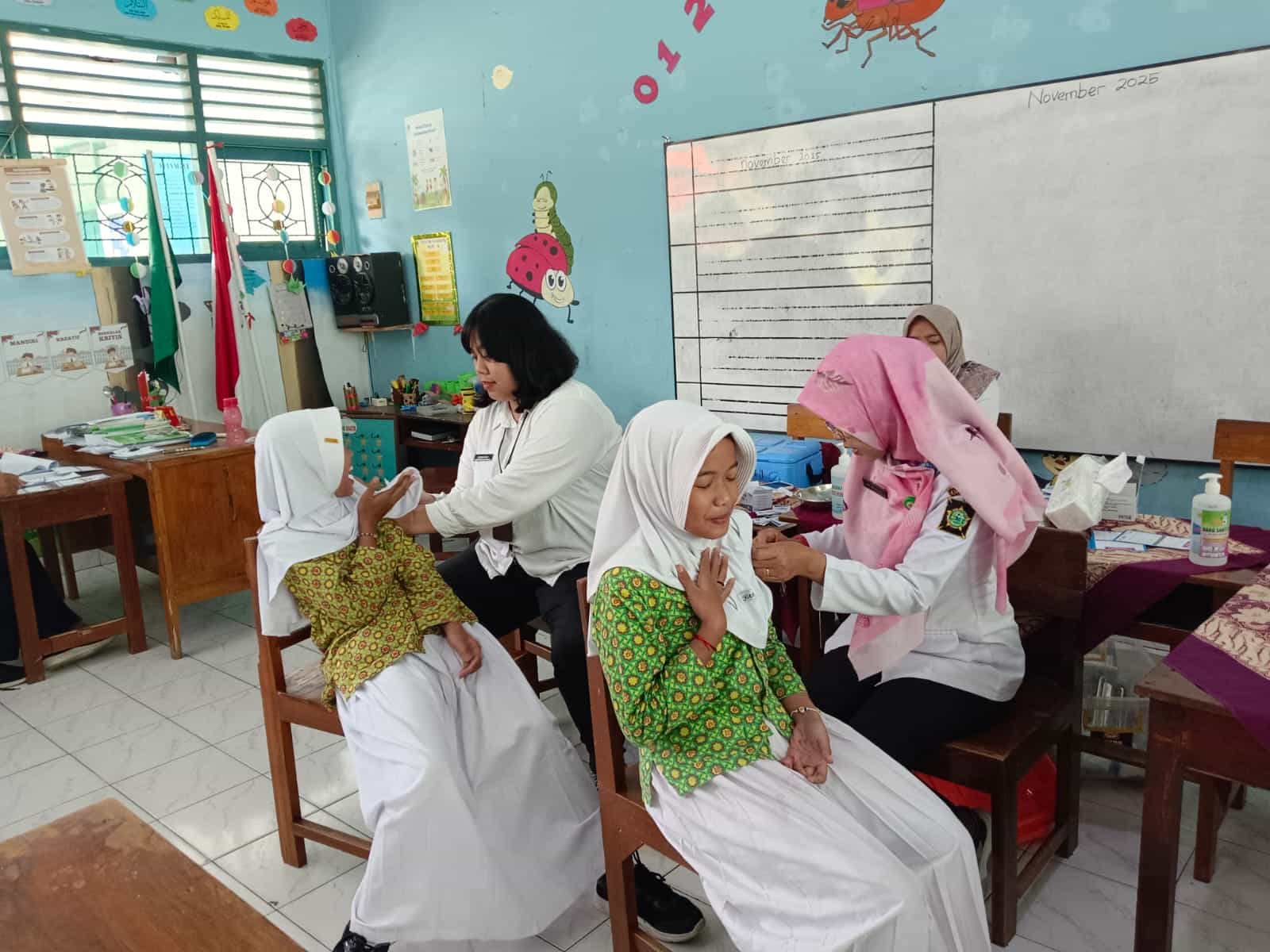 Proses imunisasi berjalan tertib dan kondusif. Tenaga kesehatan yang hadir antara lain Akbar Tanjung, S.KM., Afifah, S.Kep, Ners., Ari Margiati, A.Md, Keb., dan Alisa, A.Md, Kep. Mereka memberikan pendampingan mulai dari pengecekan kesehatan hingga pelaksanaan suntik imunisasi.
