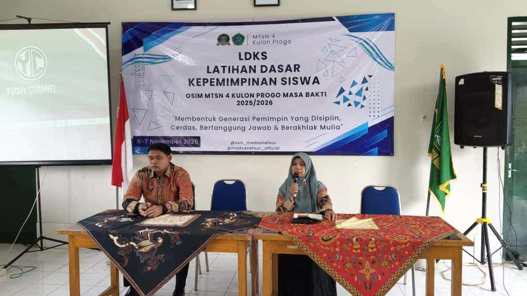 Kulon Progo (MTsN 4 Kulon Progo) – Bekali pengurus Organisasi Siswa Intra Madrasah (OSIM) MTsN 4 Kulon Progo Masa Bakti 2025-2026, madrasah selenggarakan Latihan Dasar Kepemimpinan Siswa (LDKS) yang diikuti unsur Pengurus OSIM terlantik dan Majelis Perwakilan Kelas (MPK). Pembukaan dilaksanakan Kamis pagi (6/11/2025) di ruang pertemuan unit 1 madrasah setempat, oleh kepala madrasah Hj. Asnah El Amien, S.Ag., M.S.I.