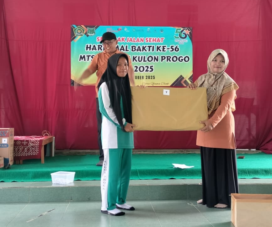 Kulon Progo (MTsN1KP) – Jumat (31/10/2025) MTsN 1 Kulon Progo membagikan puluhan hadiah lomba antar kelas dan doorprize menarik. Kegiatan ini dilaksanakan dalam rangkaian Hari Amal Bakti yang ke-56 MTsN 1 Kulon Progo yang berlangsung secara meriah dan khidmat. Kegiatan berlangsung usai seluruh siswa mengikuti jalan sehat.