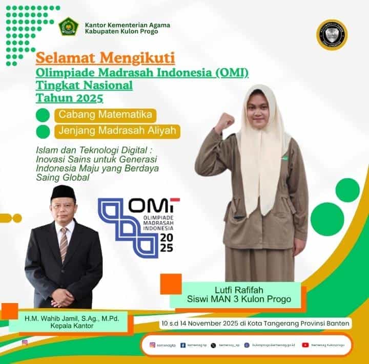 Kulon Progo (MAN3KP) – Keluarga besar MAN 3 Kulon Progo menyampaikan ucapan selamat dan dukungan penuh kepada Lutfi Rafifah, siswi berprestasi yang mewakili Daerah Istimewa Yogyakarta dalam ajang Olimpiade Madrasah Indonesia (OMI) Tingkat Nasional Tahun 2025 pada mata pelajaran Matematika jenjang Madrasah Aliyah.