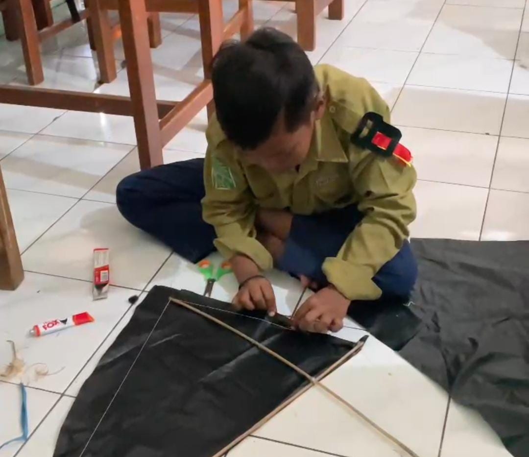 Siswi MIM Kenteng, Mushthofa Anugrahing Budiyanto ikut aktif dalam membuat layangan. “Saya membuat layangan bersama dengan teman-teman dan guru. Saya sudah menyiapkan bambu dan plastik dari rumah. Saat di kelas kami tinggal menyusun, merangkai, dan merapikan,” ungkap Mushthofa. (ras/abi).