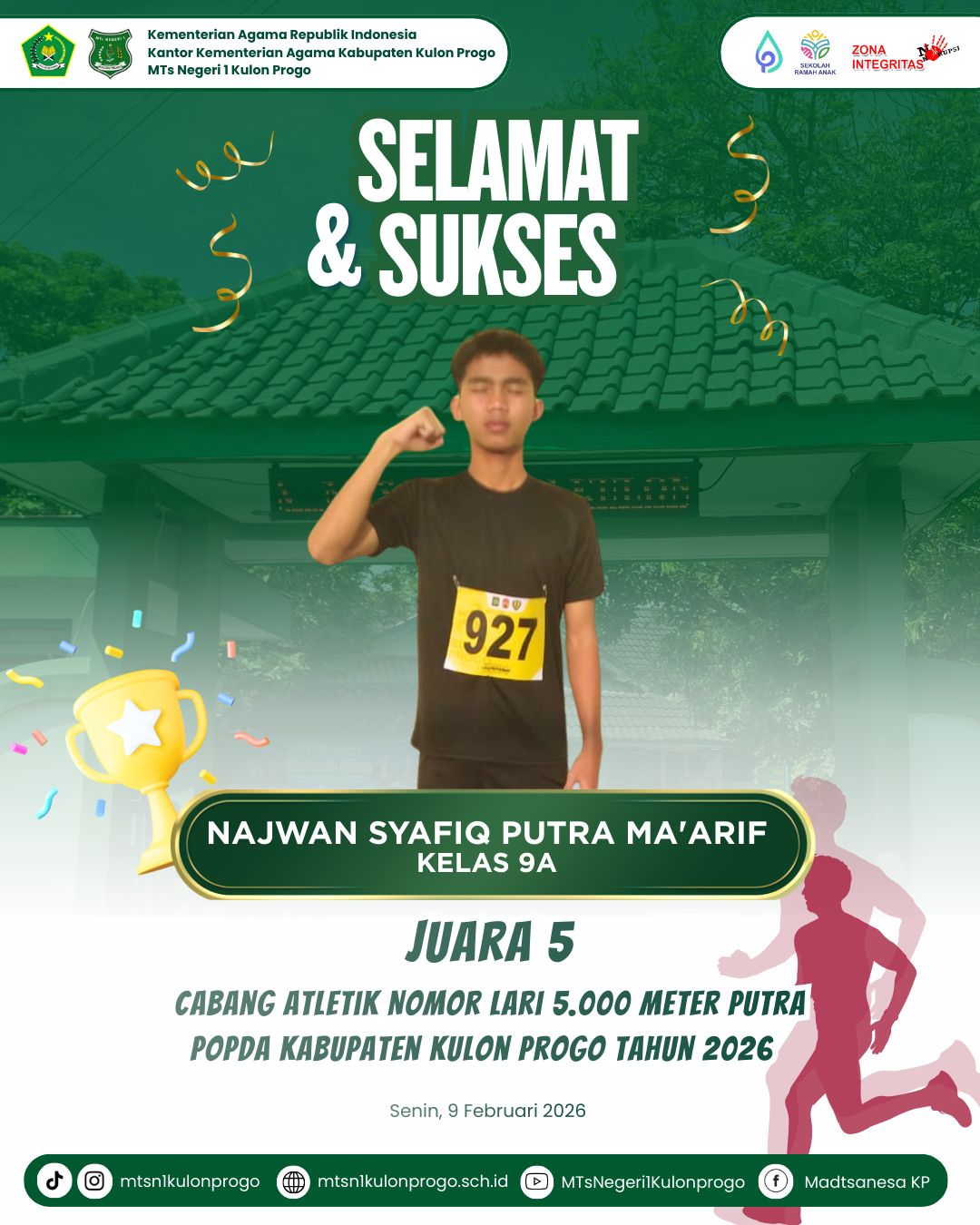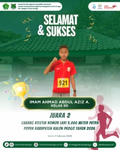 Kulon Progo (MTsN1KP) – Dua atlet MTsN 1 Kulon Progo masuk 5 besar dalam seleksi Pekan Olahraga Pelajar Daerah (POPDA) Tingkat Kabupaten pada cabang olahraga atletik lari 5000m. Mereka adalah Imam Ahmad Abdul Aziz dan Najwan Syafiq Putra Maarif. Kegiatan dilaksanakan pada Senin (9/2/2026) bertempat di Stadion Cangkring, Kulon Progo. Kegiatan ini menjadi ajang penjaringan atlet pelajar terbaik untuk melaju ke tingkat berikutnya.