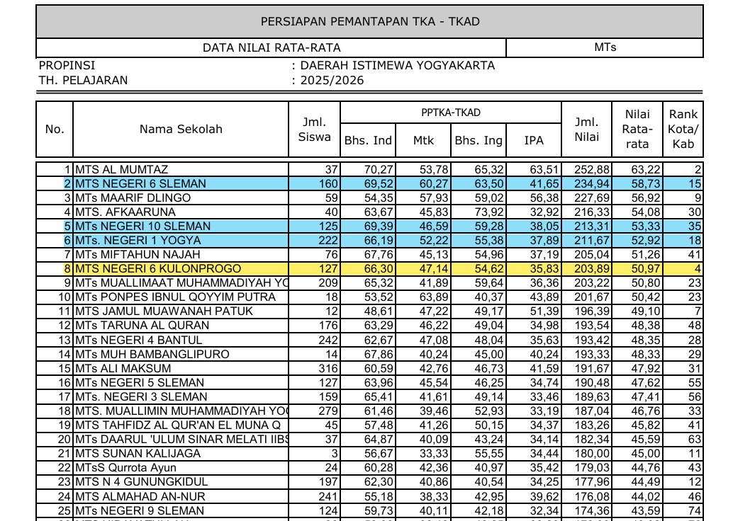 Kulon Progo (MTsN6KP) – MTsN 6 Kulon Progo meroket dalam prestasi. Ada beberapa raihan prestasi madrasah ini dalam PP TKAD (Persiapan Pemantapan Tes Kemampuan Akademik Daerah) tingkat provinsi. Di antaranya, MTsN 6 Kulon Progo menempati peringkat 1 dari 16 MTs Negeri dan Swasta se-Kabupaten Kulon Progo, DI Yogyakarta.