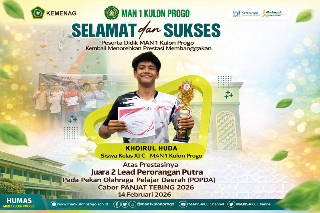 Kulon Progo (MAN 1 KP) – Prestasi membanggakan kembali ditorehkan peserta didik MAN 1 Kulon Progo. Khoirul Huda, siswa kelas XI-C, berhasil meraih Juara 2 kategori lead perorangan putra cabang olahraga panjat tebing pada ajang Pekan Olahraga Pelajar Daerah Kulon Progo (Popda) 2026.