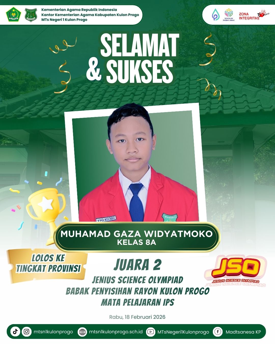 Kulon Progo (MTsN 1 KP) — Siswa-siswi MTs Negeri 1 Kulon Progo kembali mengukir prestasi gemilang dalam ajang Jenius Science Olympiad (JSO) 2026. Dalam babak penyisihan Rayon Kulon Progo yang berlangsung di SD IT Ibnu Mas’ud, beberapa waktu yang lalu, delegasi MTsN 1 Kulon Progo berhasil menyabet sejumlah gelar juara di berbagai bidang studi. Pengumuman hasil disampaikan oleh panitia pada Rabu (18/2). Demikian disampaikan oleh Ani Minarni, S.Pd. selaku koordinator prestasi akademik.